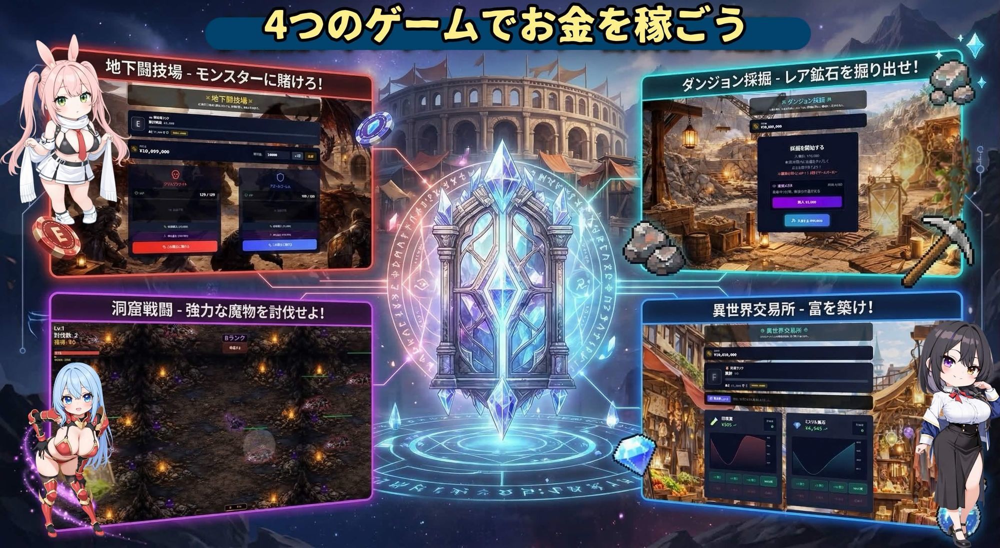 異世界の商品(薬草・魔石・ドラゴンの牙など)を売買する投資ゲーム。